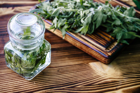 Leonurus cardiaca, motherwort, throw-wort, lion's ear, lion's tail medicinal plant. Transparent glass jar with condemned herbal. Ingredient for cosmetology and non-traditional medicine.