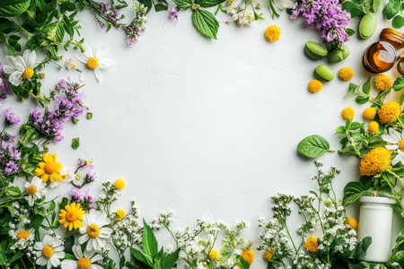 Flat lay, flowers, bright greens and medicinal herbs on white background with copy space, top view