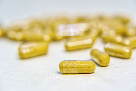 Herb capsules, Nutritional Supplement, Vitamin Pills, Herbal Medicine on white background.