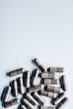 top view of black pills on white background with copy space