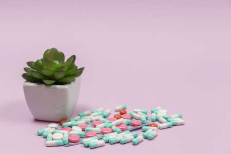 Different medication pills on pink background. Healthcare, medical concept