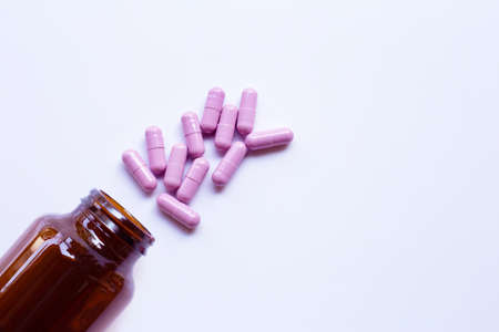 Bottle with purple medicine capsules pills on white