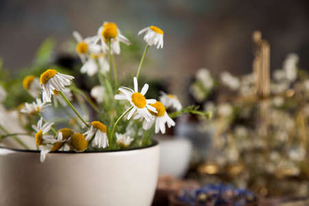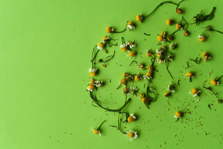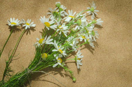 Chamomile for tea close-up with copy space. A bouquet of summer daisies for medical purposes, for health.