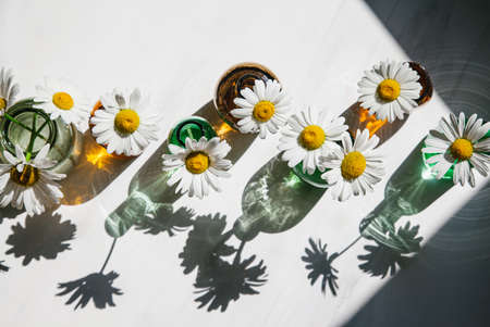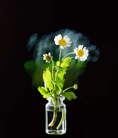 Chamomile large bouquet in a transparent vase closeup with copy space for text. Natural cosmetics on a camomile basis for young and mature skin. Healthy skin concept.