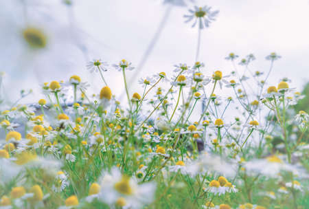 Field of camomiles. Daisies in a field. Beautiful nature scene with blooming medical chamomiles. Beautiful meadow. Summer background