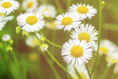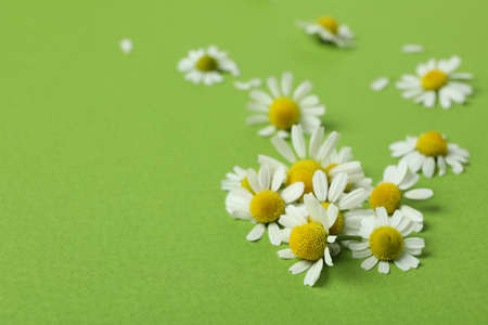 Beautiful Macro close up of chamomile Flowers / plant on green background