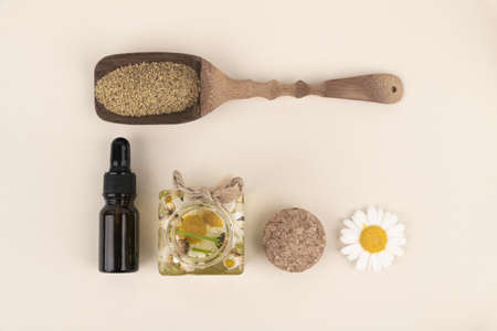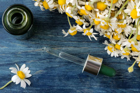 Medicinal chamomile and chamomile extract in a bottle. oil from chamomile flowers. aromatherapy. a drug. on a blue wooden table. top view.