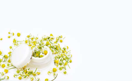 Chamomile medical cream. Chamomile plants and cream jar. Chamomile plant on white background. Copy space frame