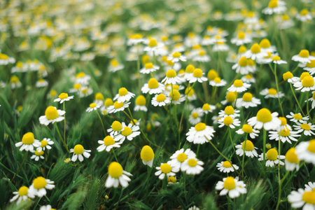 Chamomile flowers field. Summer Daisies. Beautiful nature scene with blooming medical chamomilles. Alternative medicine herb. Camomile Spring flower background Beautiful meadow