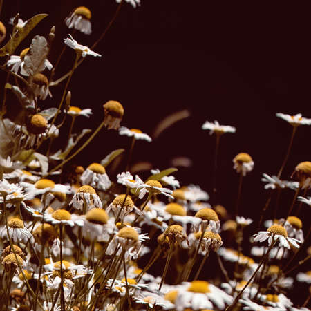 White and yellow chamomile flowers close-up on black fne with space for copyspace text. Floral background of wild daisies. Medicinal herbs, useful plants, summer flowers