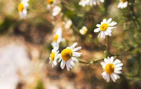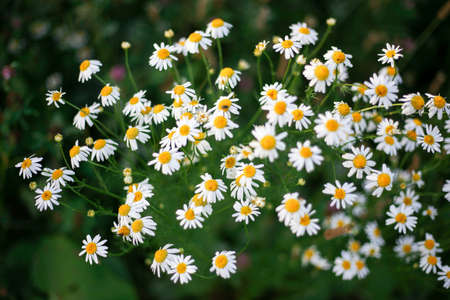 Group of Chamomile blossom in garden. Alternative medicine herbs. Scientific name Matricaria recutita, Matricaria chamomilla.