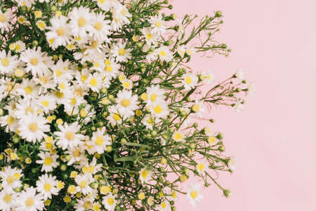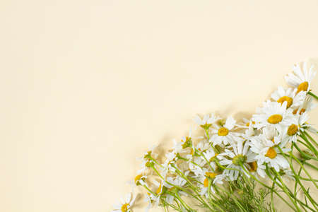 Bouquet of field daisies on a beige pastel background, top view, place for text, copy space.
