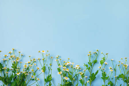 Chamomile Medicinal little daisy flowers and petals on a gentle light blue background. top view