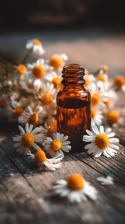 Dark amber glass bottle containing essential oil, placed among chamomile daisies on a weathered wooden surface. Natural lighting accentuates texture and highlights the daisy blooms.