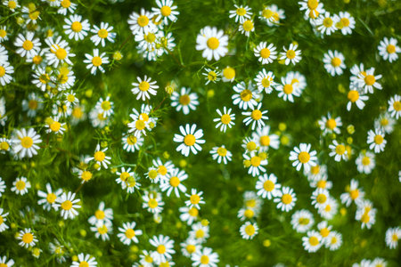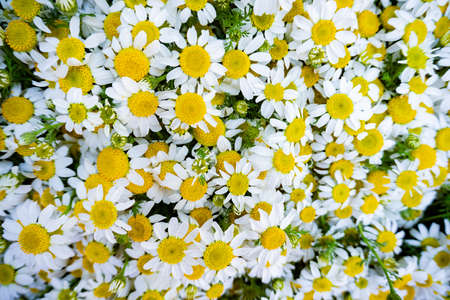 Herbs in nature. Fild of camomiles at sunny day at nature. Camomile daisy flowers. Chamomile flowers field wide background in sun light. Matricaria chamomilla. Flower texture. Top view