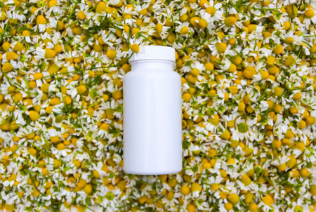 White plastic containers and Chamomile flowers for cosmetic products, herbal tea or treatment.