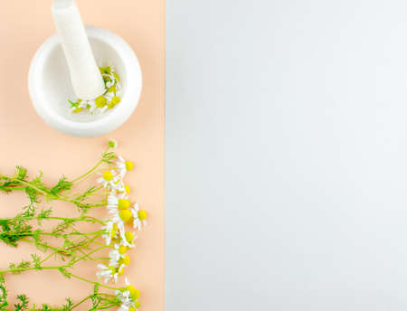 A bouquet of daisies and a mortar with daisies on a beige background with a place for an advertising display of products. Concept for the production of products from natural herbs. Natural Organic Product