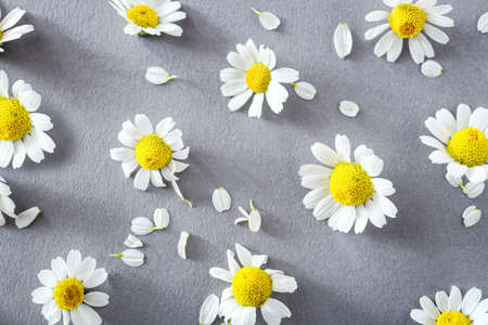 Pattern with chamomile flowers on white background. Flat lay, top view
