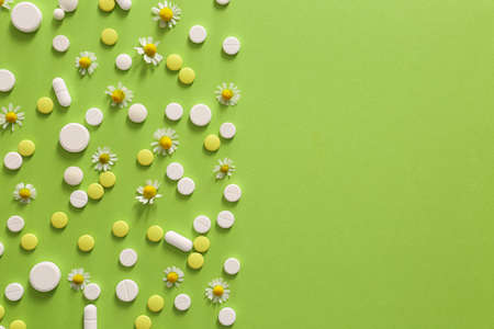 White flowers of medical chamomile are laid out on a blue background with tablets and capsules. Copy space for text, design.