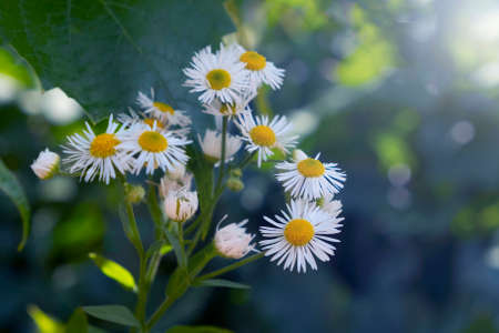 Beautiful white daisy flowers bloom on a summer night. The beauty of nature and wildflowers.