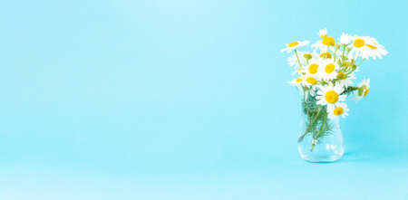 Beautiful summer bouquet of white daisies in a glass transparent vase on a blue background. Copy space. Banner