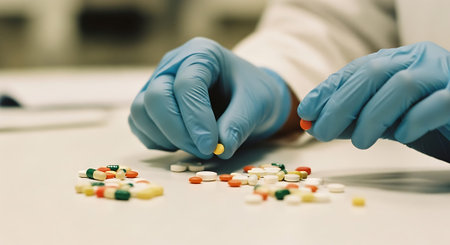 A focused healthcare worker, clad in a white lab coat and blue gloves, meticulously sorts bright red capsules in a clean, clinical setting. The image captures the essence of precision and care in pharmaceutical practices, highlighting the importance of medication management and safety.