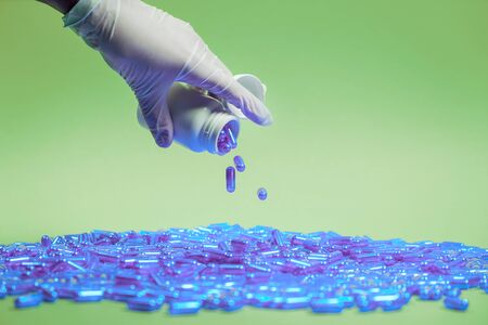 A hand with blue latex gloves grabbing hand full of medicines, Capsules for Vitamines,drugs,medication. Health,business concept