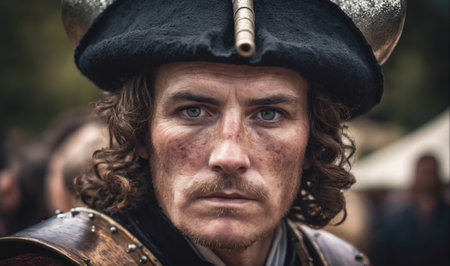 A man dressed in 17th-century clothing stares intently at the camera while wearing a black hat with a metal band