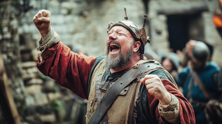 A king in medieval attire celebrates triumph raising his fists in joy among cheering subjects in a rustic village setting.