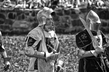 RITTER WEG, MOROZOVO, APRIL 2017: Festival of the European Middle Ages. Portrait of medieval knight in helmet and chain mail battle on swords with shield in their hand.