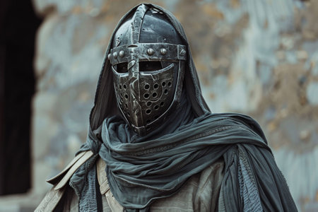 A man in a medieval costume with a helmet and a scarf. The man is standing in front of a wall