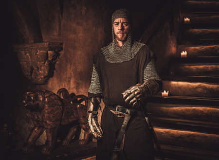 Medieval knight in ancient castle interior.