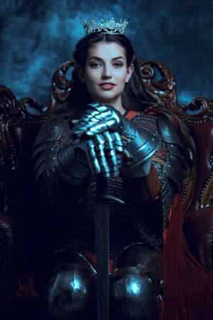 The Middle Ages history. Portrait of a beautiful medieval queen in knightly armor sitting on a throne and holding a sword.