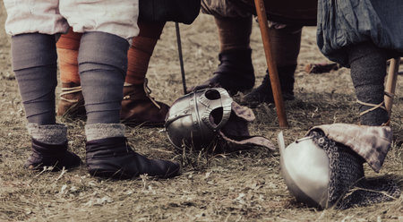 Medieval battle scene with cavalry and infantry. Selective focus.