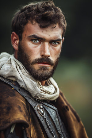 Portrait of a medieval warrior with a beard in a leather jacket