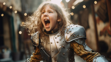 Joan of Arc, God's Warrior. Short haired young woman in armor at sunset