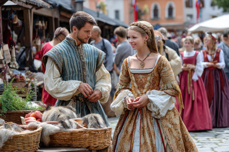 A couple in period costumes strolls through a lively marketplace filled with vendors and customers.