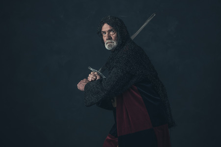 Half-length portrait of brutal seriuos man, medieval warrior or knight with dirty wounded face holding sword isolated over dark background. Comparison of eras