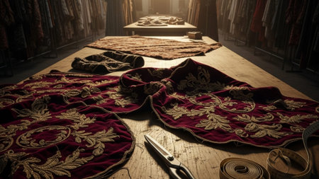 This image showcases a beautiful ornate textile featuring intricate floral patterns, accompanied by various crafting tools on a rustic wooden surface, highlighting artistry and creativity.