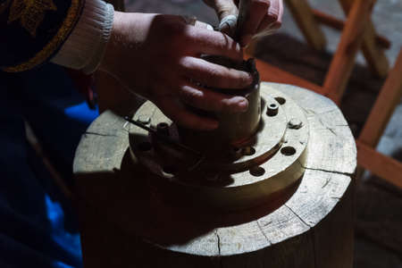 Shoemaker artisan at work. Vintage master workshop for the production of shoes. Repair boots in the old days.