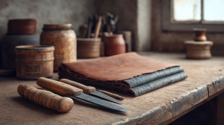 A warm and inviting workshop scene featuring leather, hand tools, and wooden utensils. This image captures the essence of artisanal craftsmanship and creativity.