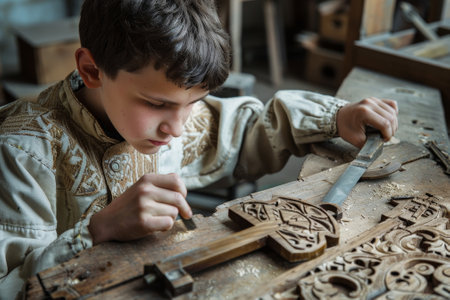 A young boy is working on a wooden cross, using a saw to cut it. The scene is set in a workshop, with various tools and materials scattered around. The boy appears focused and determined