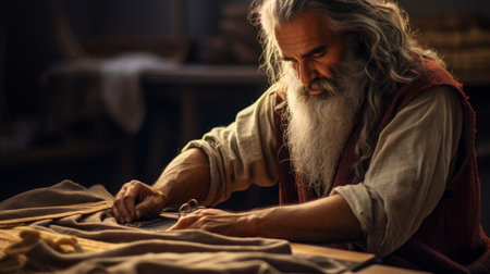 Greek tailor crafting intricate garments with fabric and patterns