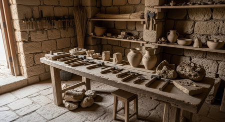 Rustic pottery workshop with clay tools and carved vases in ancient stone room