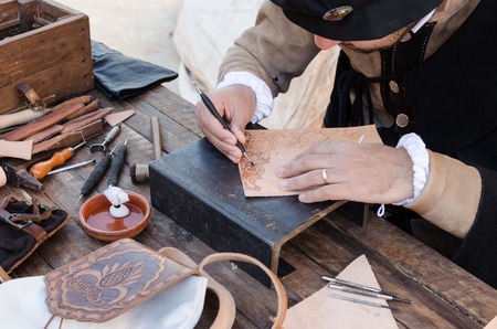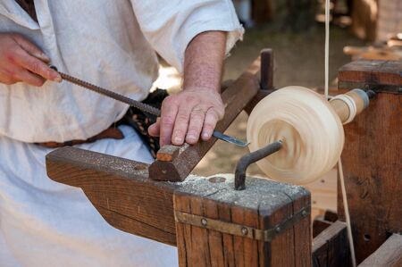 ALCALA DE HENARES, SPAIN - OCTOBER 10, 2016: craftsman carpenter dressed with medieval clothes using several tools to carve wooden key chains during the celebration of a medieval festival