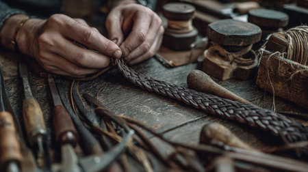 First-Person View of Hands Braiding Leather Straps in Rustic Workspace