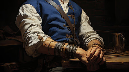 Close up of a man in a medieval costume sitting at the table