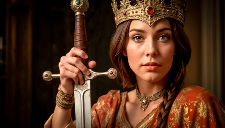 Medieval crown, sword, and an old letter arranged on a wooden table, creating a royal and historical scene with dramatic antique textures.