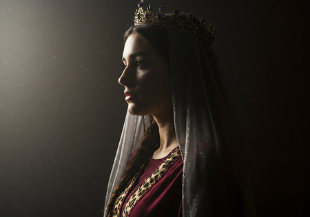 A captivating profile portrait of a woman draped in a flowing, translucent veil, adorned with a jeweled crown. Generative Ai