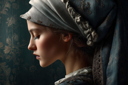 Young caucasian female in vintage attire with headscarf and closed eyes.